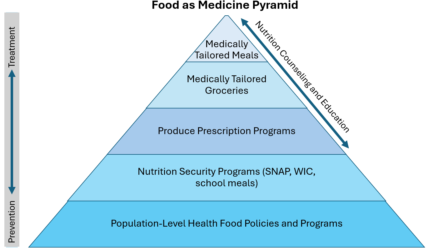 FAM interventions in pediatric settings may integrate a combination of multiple benefits including food and nutrition education to optimize health and decrease food and nutrition insecurity. The FAM pyramid focuses on the many strategies available from prevention and more population-based approaches at the base of the pyramid to more direct disease management techniques at the apex of the pyramid. Although FAM includes all of these strategies, often FAM focuses primarily on the top 3 levels of the pyramid including medically tailored meals, medically tailored groceries, and produce prescription programs.