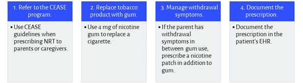 Consider pharmacologic cessation support for family members or caregivers who are moderately to severely dependent on nicotine. Use the following steps and refer to the CEASE program guidelines for NRT as needed.