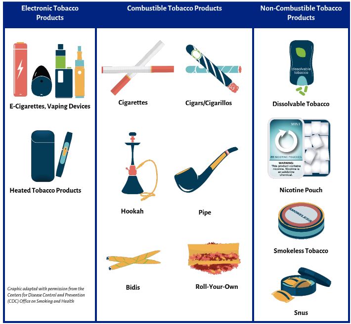 Commercial vaping and tobacco products may include (but are not limited to) any of the items shown in the graphic that follows.